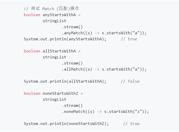 最终操作,返回一个boolean值,检测指定的Predicate是否匹配整个Stream。