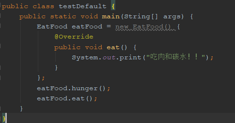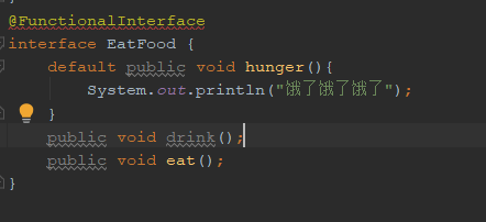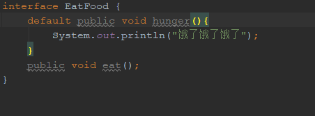 原先接口里是不能存在非抽象方法的,升级到Java8以后,就可以在接口中添加默认方法了,只用使用一个 default 关键字。比如下图中的hunger方法(啊我是真的饿了),此方法又叫虚拟拓展方法。